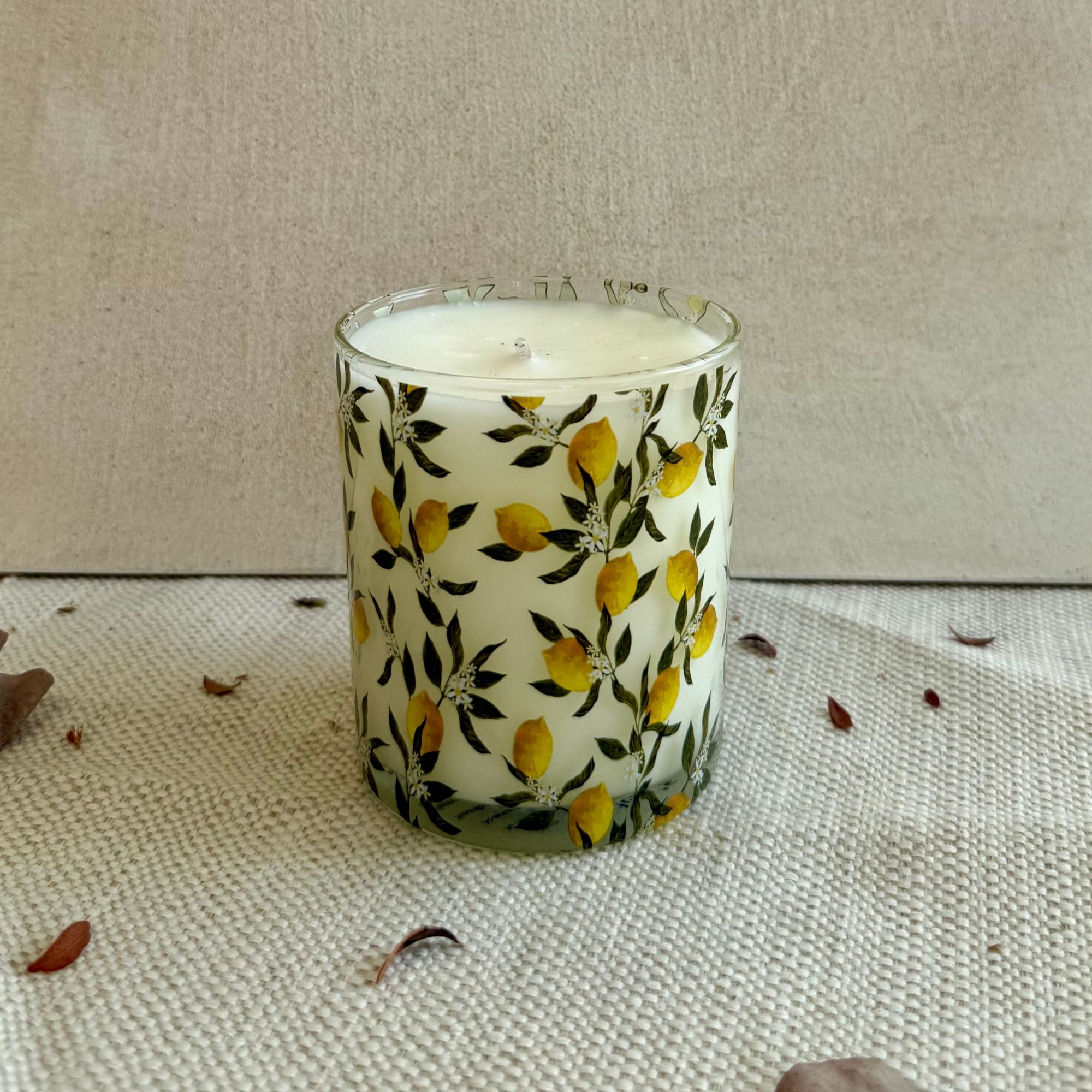 Cada una de nuestras velas es elaborada de manera artesanal, con la cera vertida a mano, lo que hace que cada pieza sea única. Se presenta en un elegante envase de vidrio redondo con una tapa dorada o plateada metalizada, con una capacidad de 230 gr.